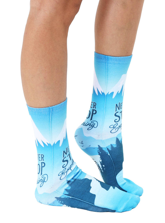 Novelty Graphic Crew Socks - "Never Stop Exploring" - Blue