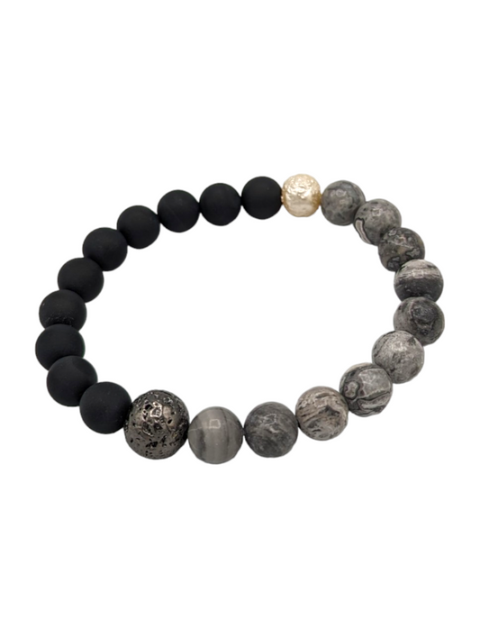 Matte Black Onyx & Map Jasper Grey Beaded Stretch Bracelet