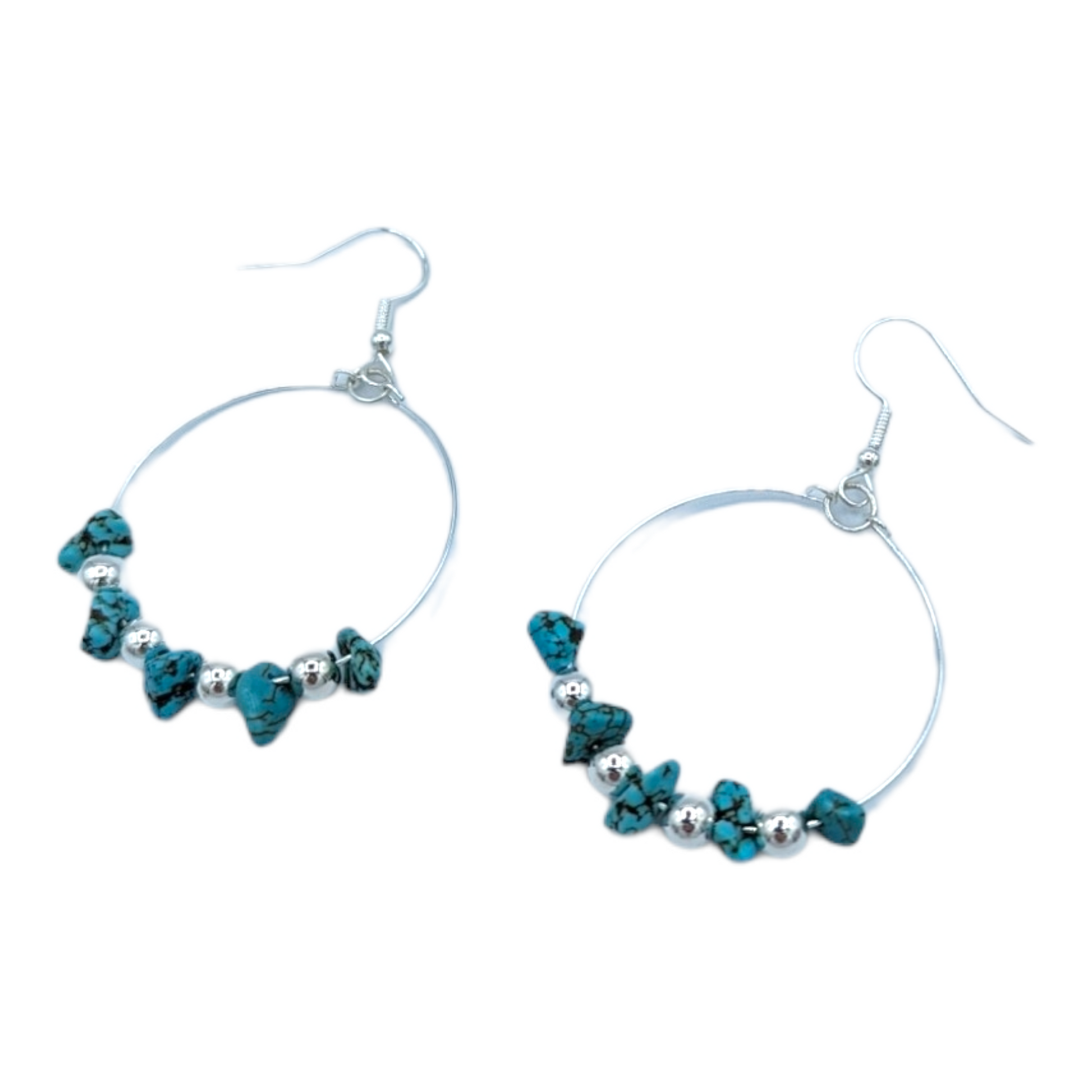 Pendientes livianos y fáciles de usar hechos con chips de turquesa howlita y cuentas espaciadoras redondas de plata esterlina, colgados de alambres de hierro sin níquel.