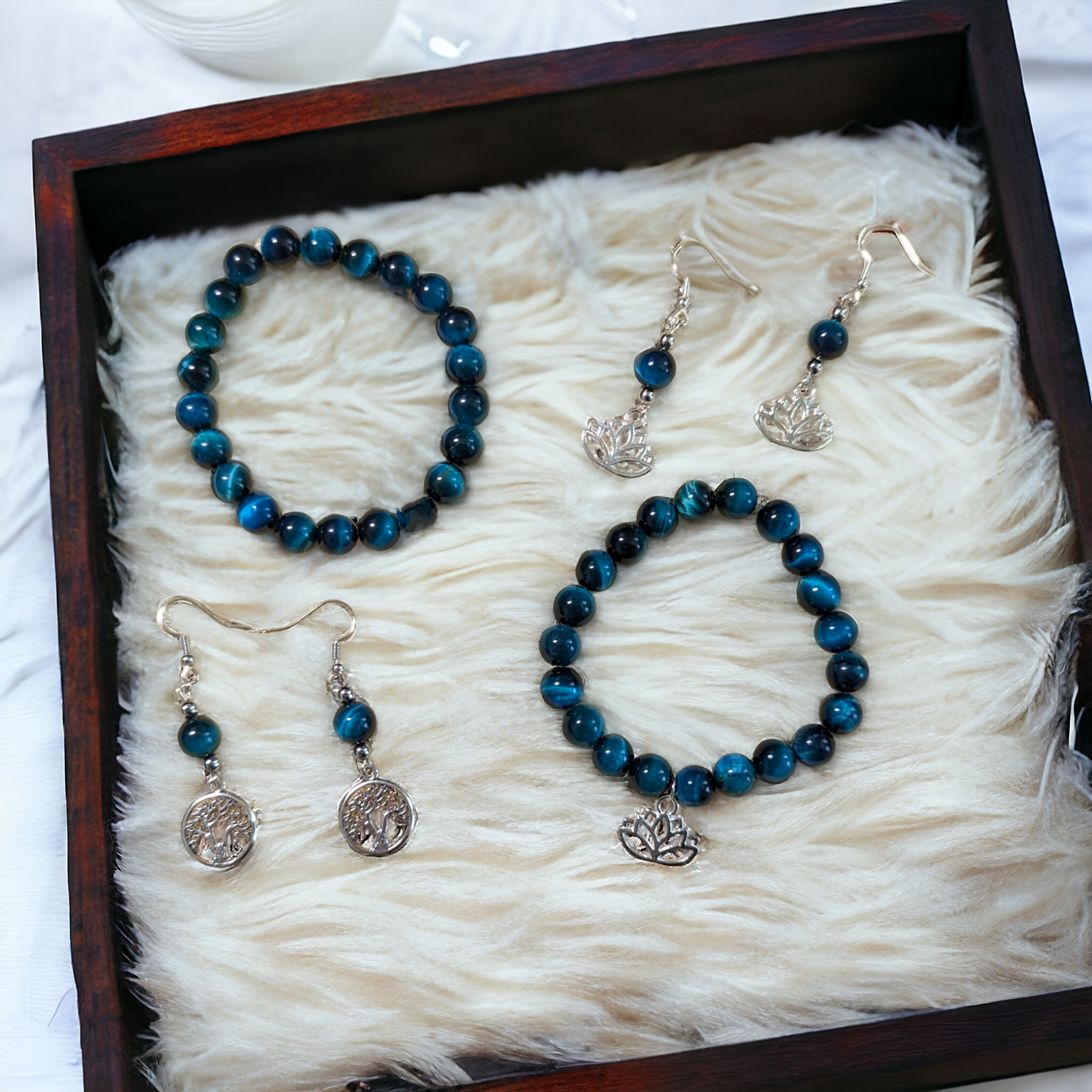 Dark Peacock Blue Tiger Eye Stretch Bracelets & Earrings Collection