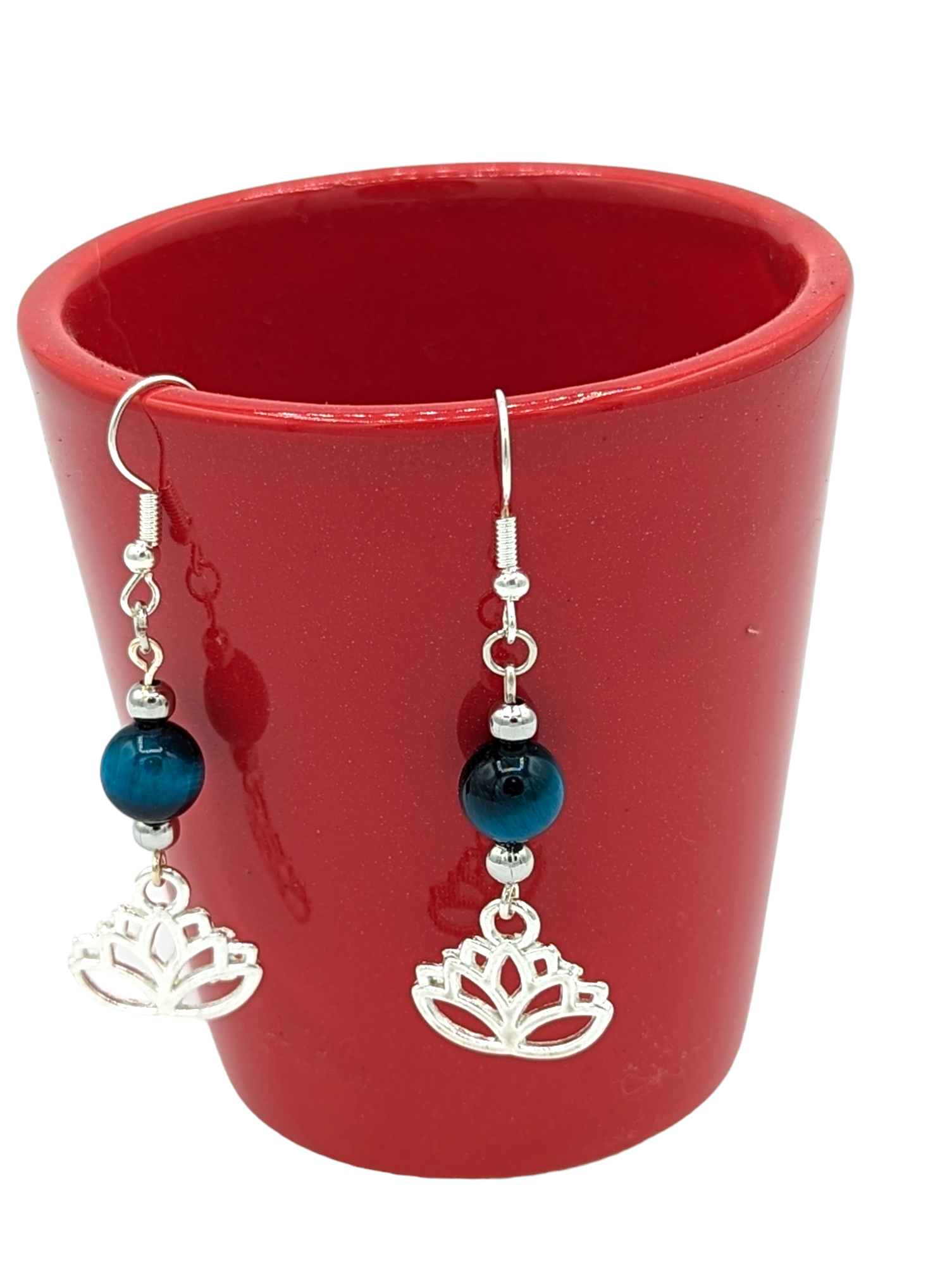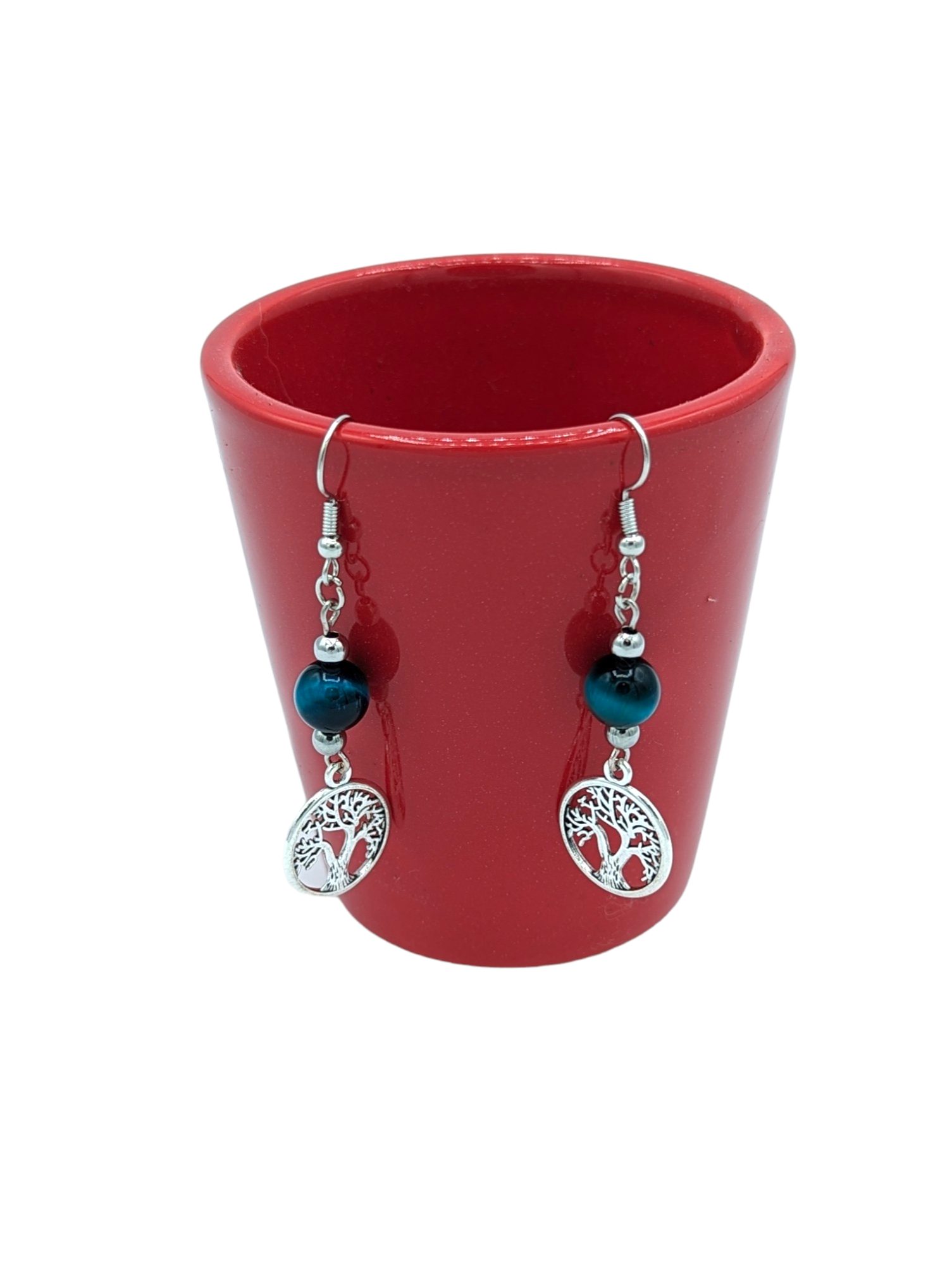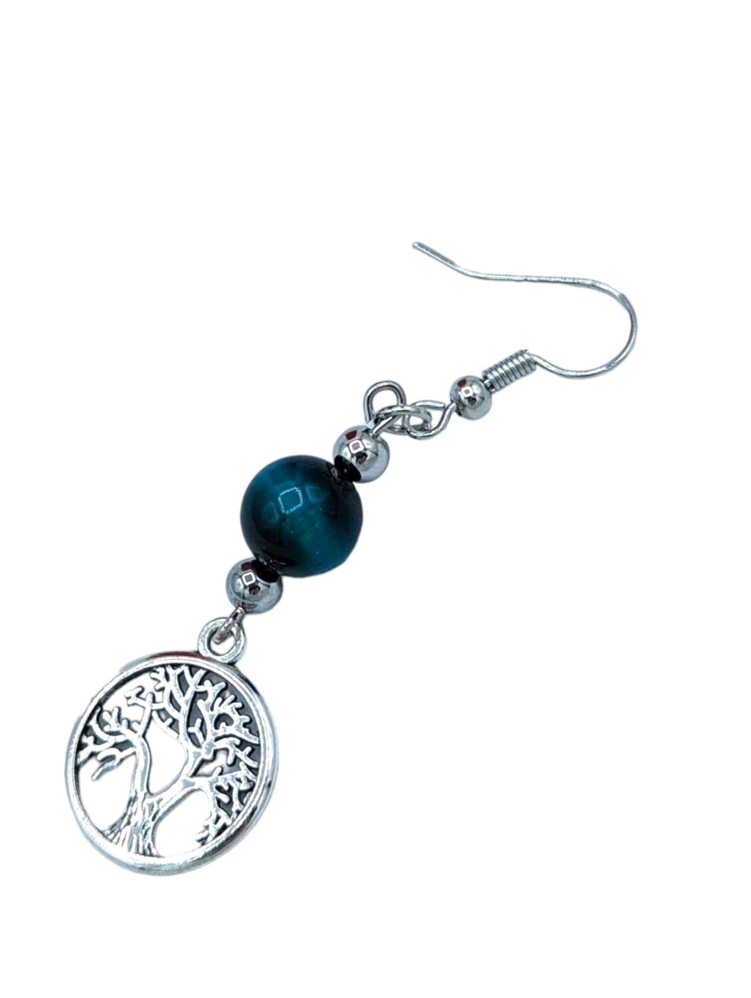 ~ Tree of Life charm earrings with matching 8 mm peacock blue tiger eye beads
