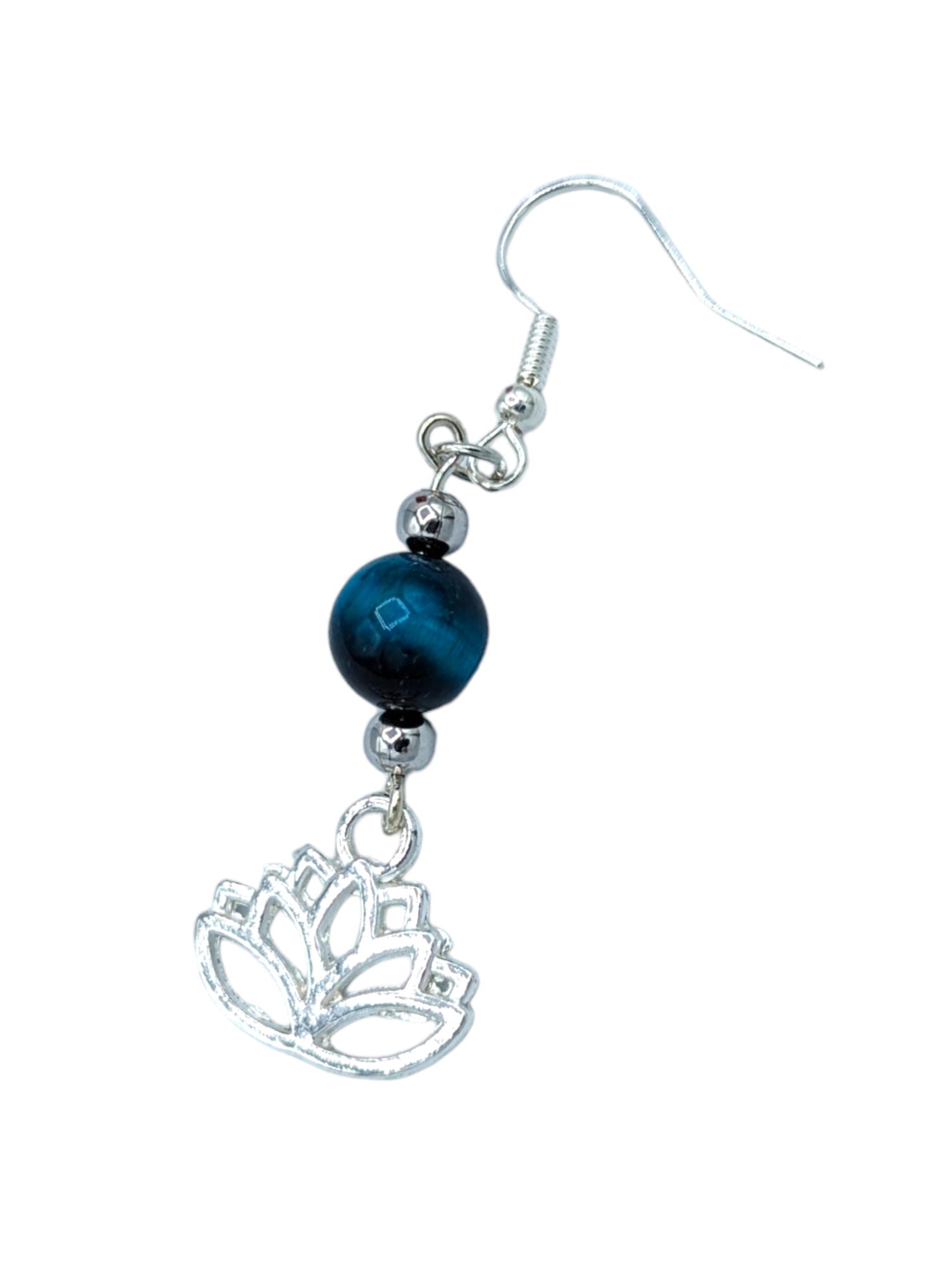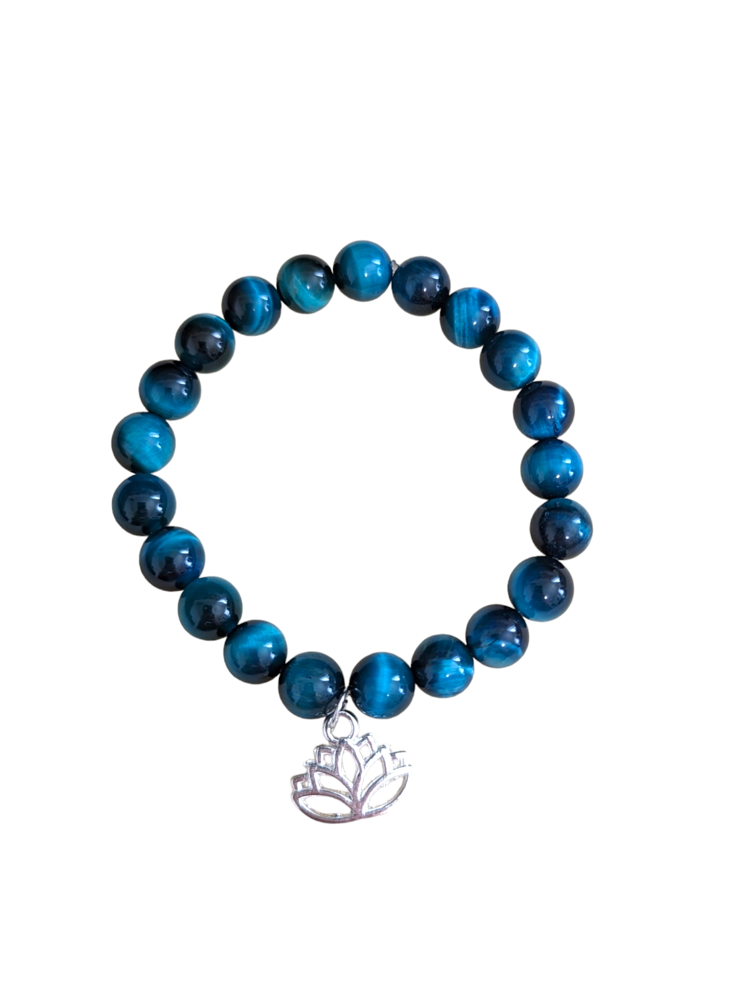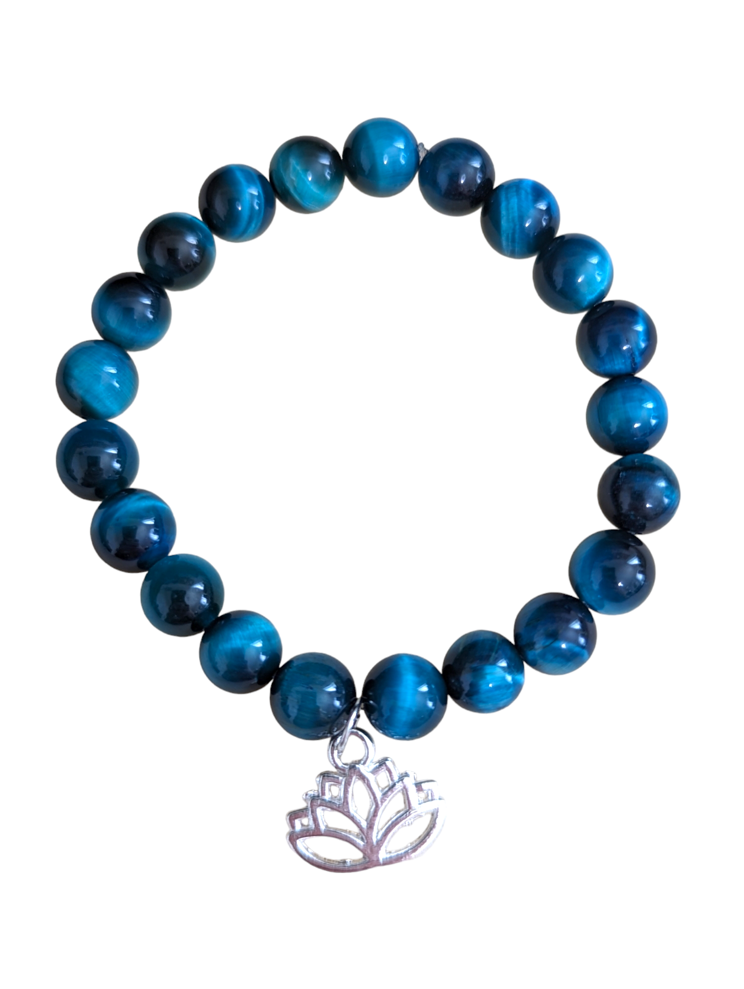 ~ 8 mm peacock blue tiger eye beads stretch bracelet~ 8 mm peacock blue tiger eye beads stretch bracelet with silver-plated lotus flower charm