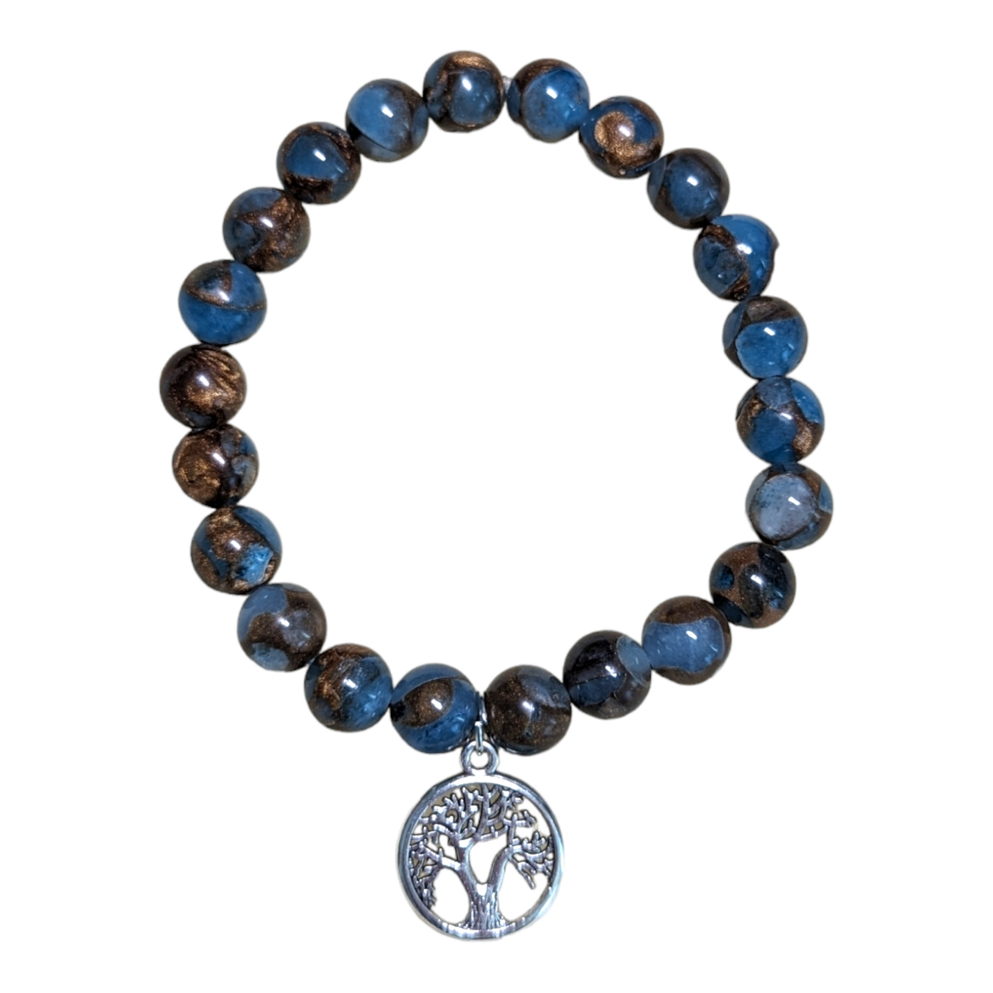 Blue-Brown Quartz Beads Stretch Bracelet w/ Tree of Life Charm