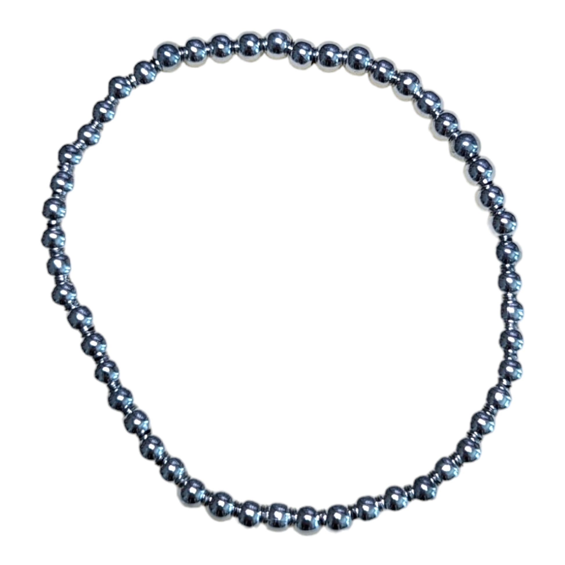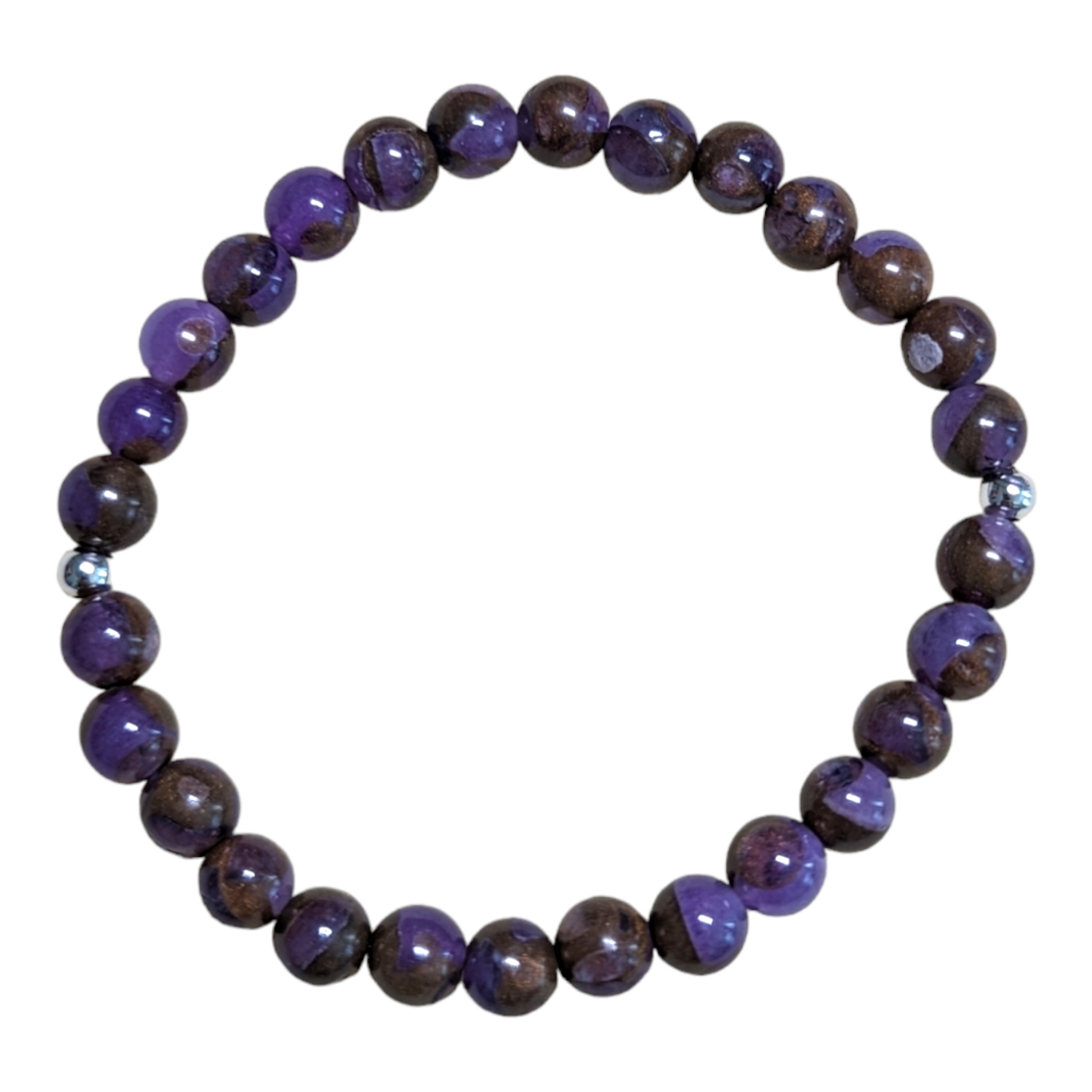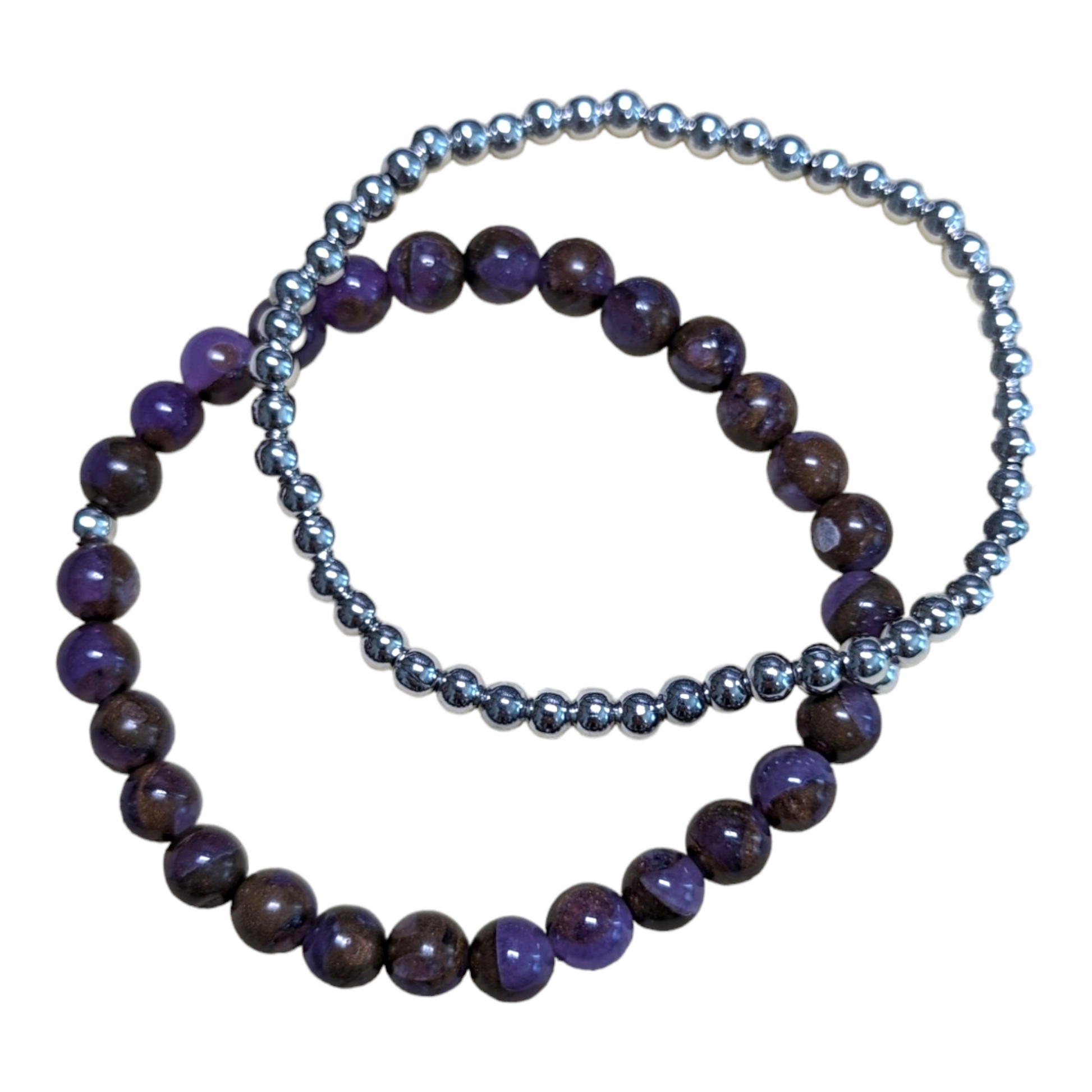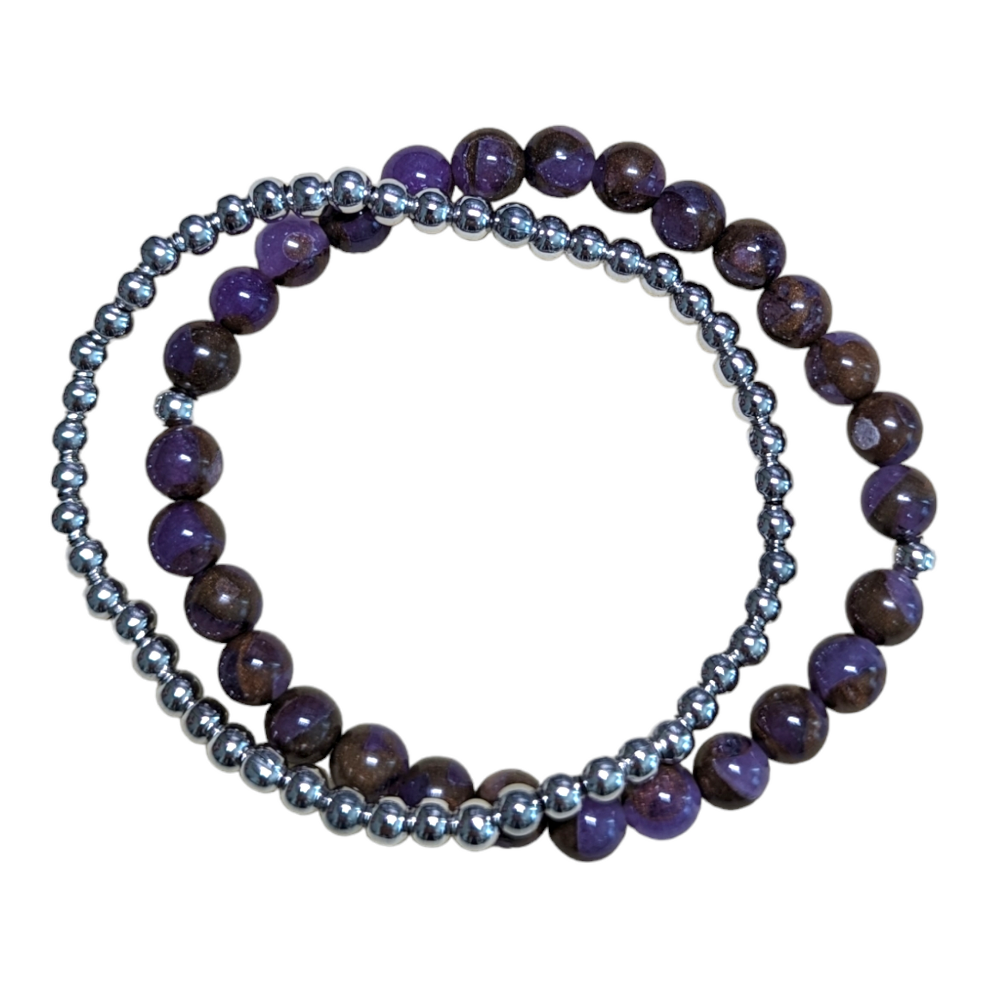 Bracelet 1 features amethyst purple and brown quartz 6mm beads with two silver brass accent beads. Bracelet 2 complements the first with all silver brass accent beads.