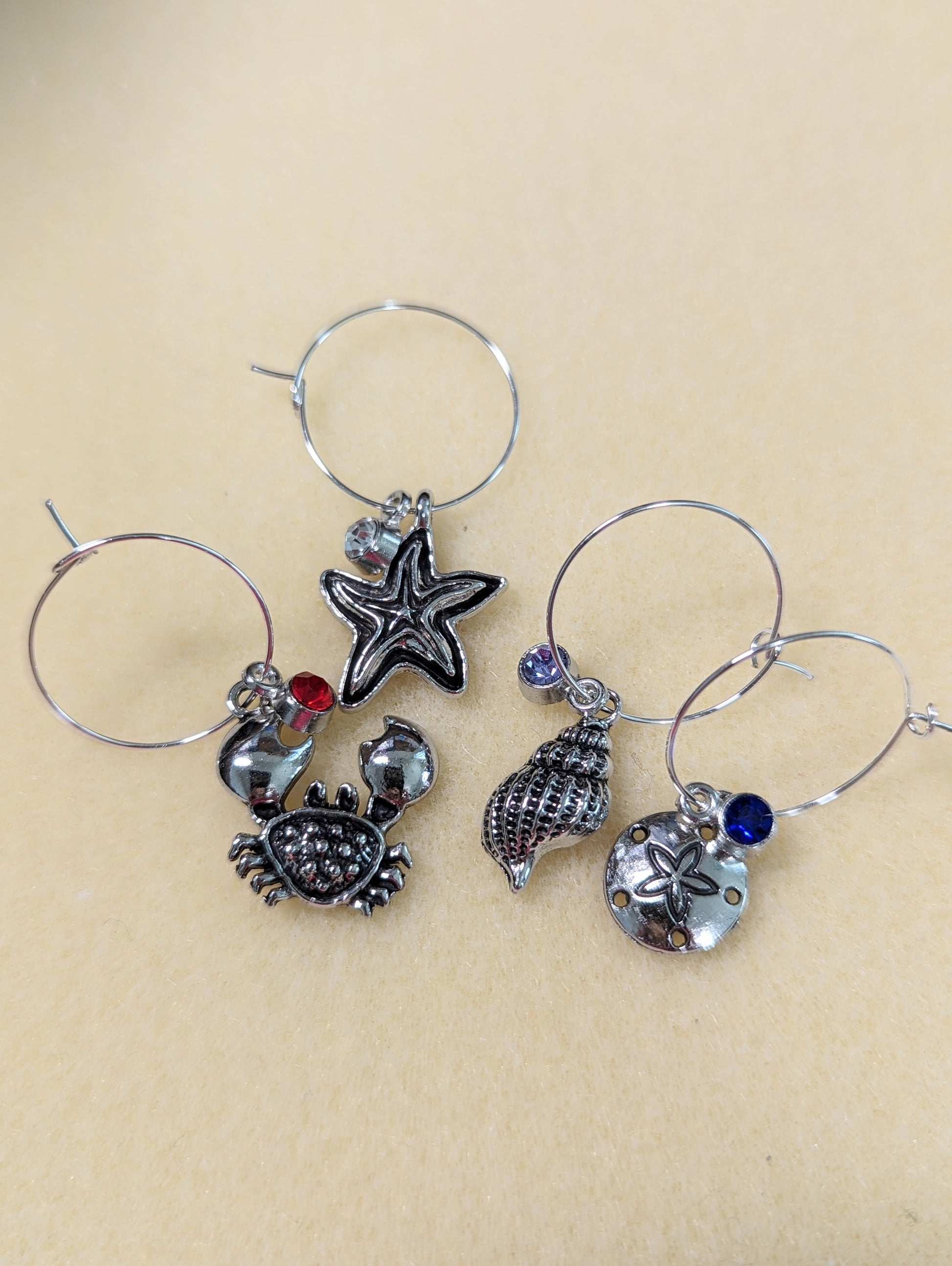 These charming handmade charms feature a uniquely colored rhinestone on each, ruby red for Crab, clear diamond for Starfish, lilac for Periwinkle, and deep ocean blue for Sand Dollar.