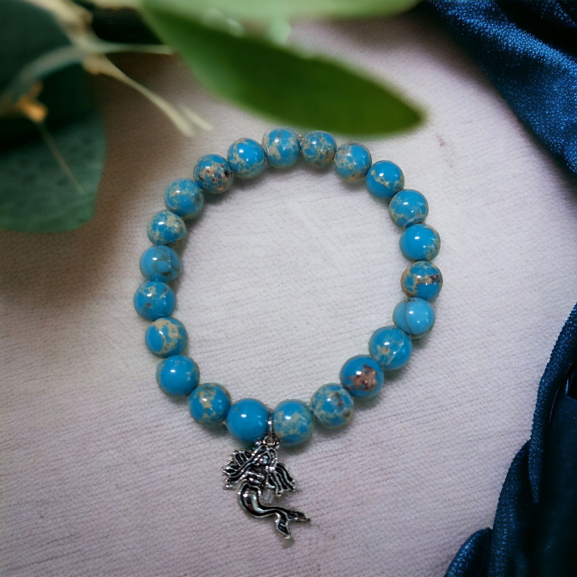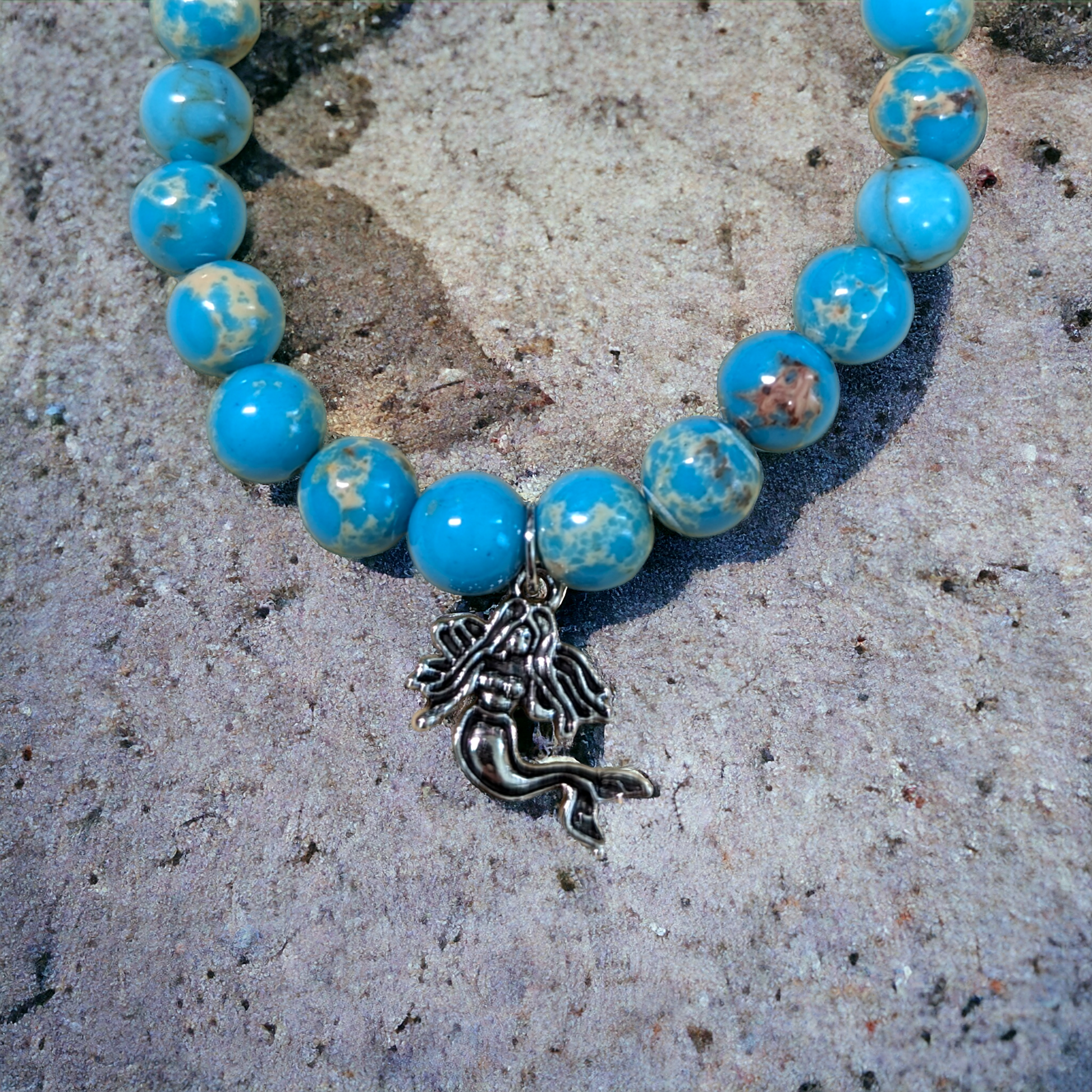 These Sea Sediment Jasper 8 mm round beads remind me of little Earth globes. This stretch bracelet features lovely sea green-blue beads with earth tones and a silver tone mermaid charm.