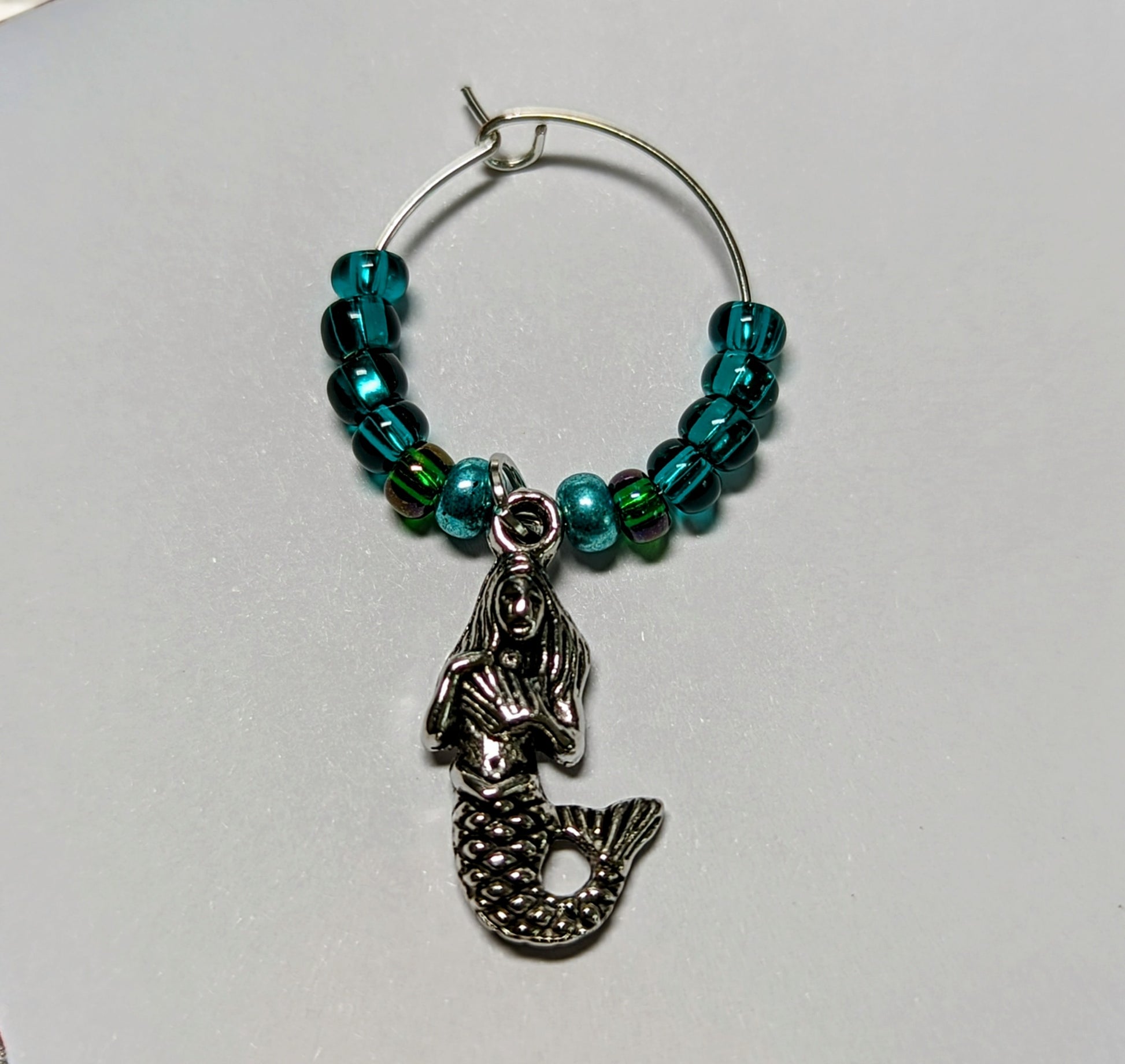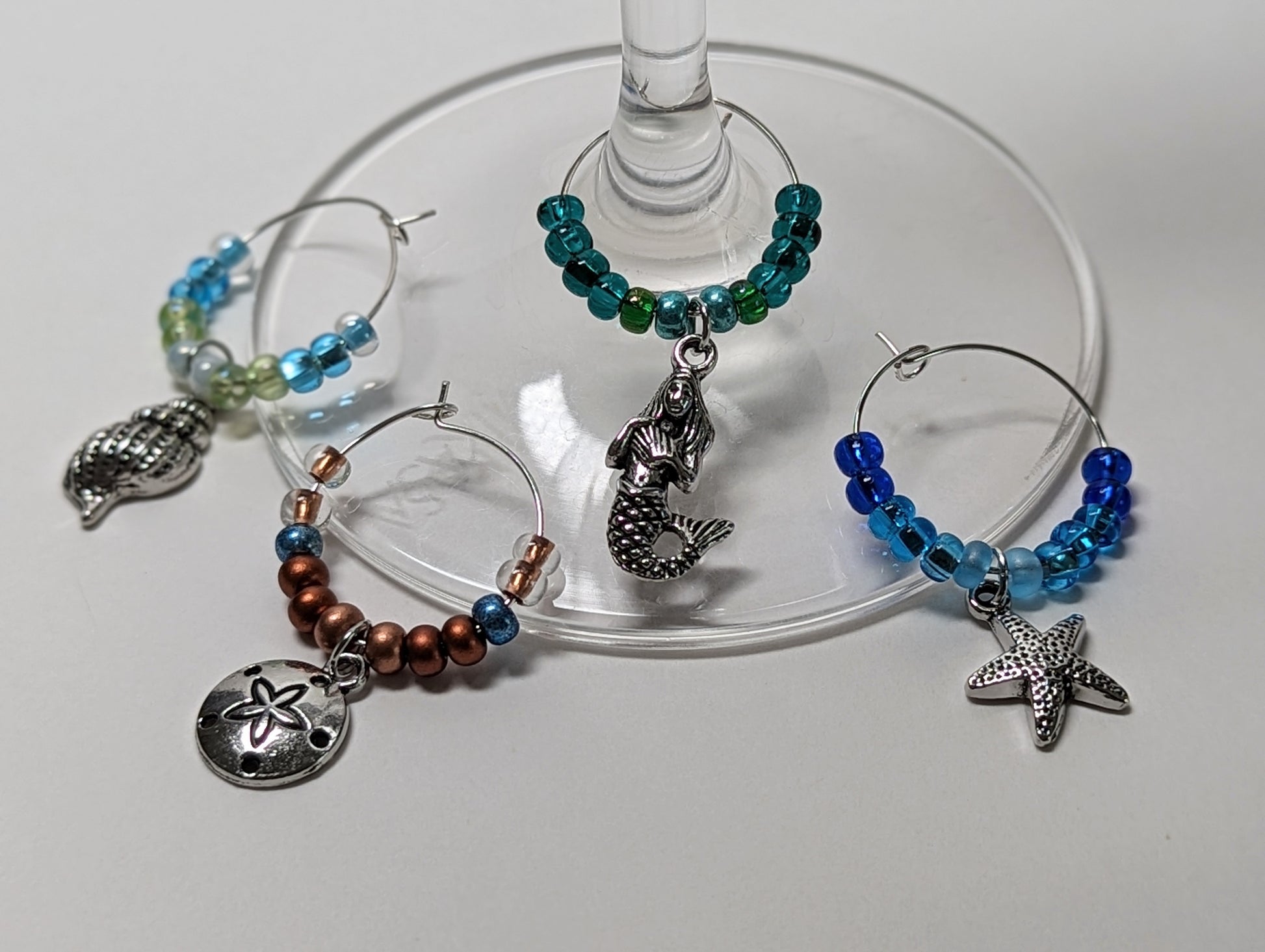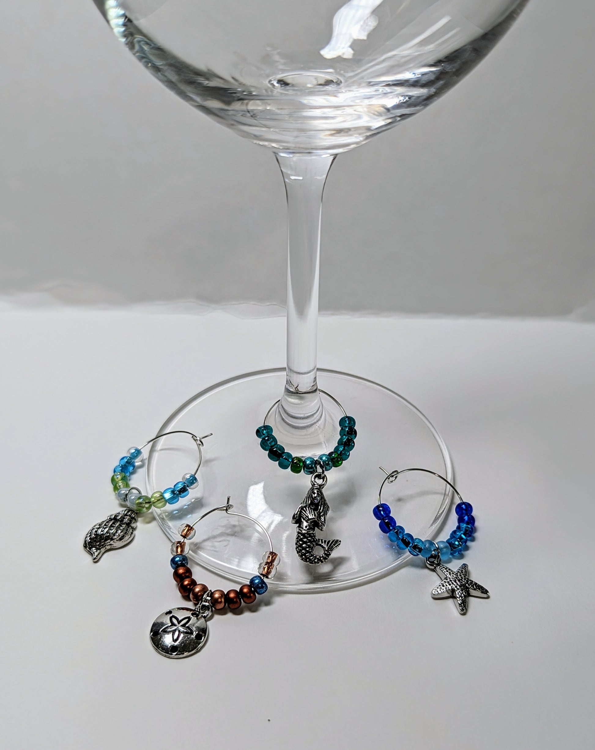 It's jewelry for your wine glass! It's our handmade "Under the Sea" wine charm collection. Use these at your next soiree so your guests will know which drink is theirs.