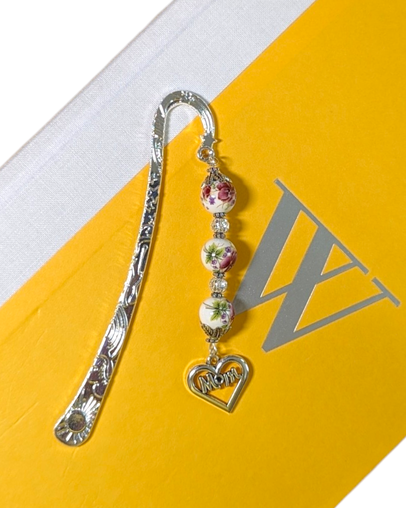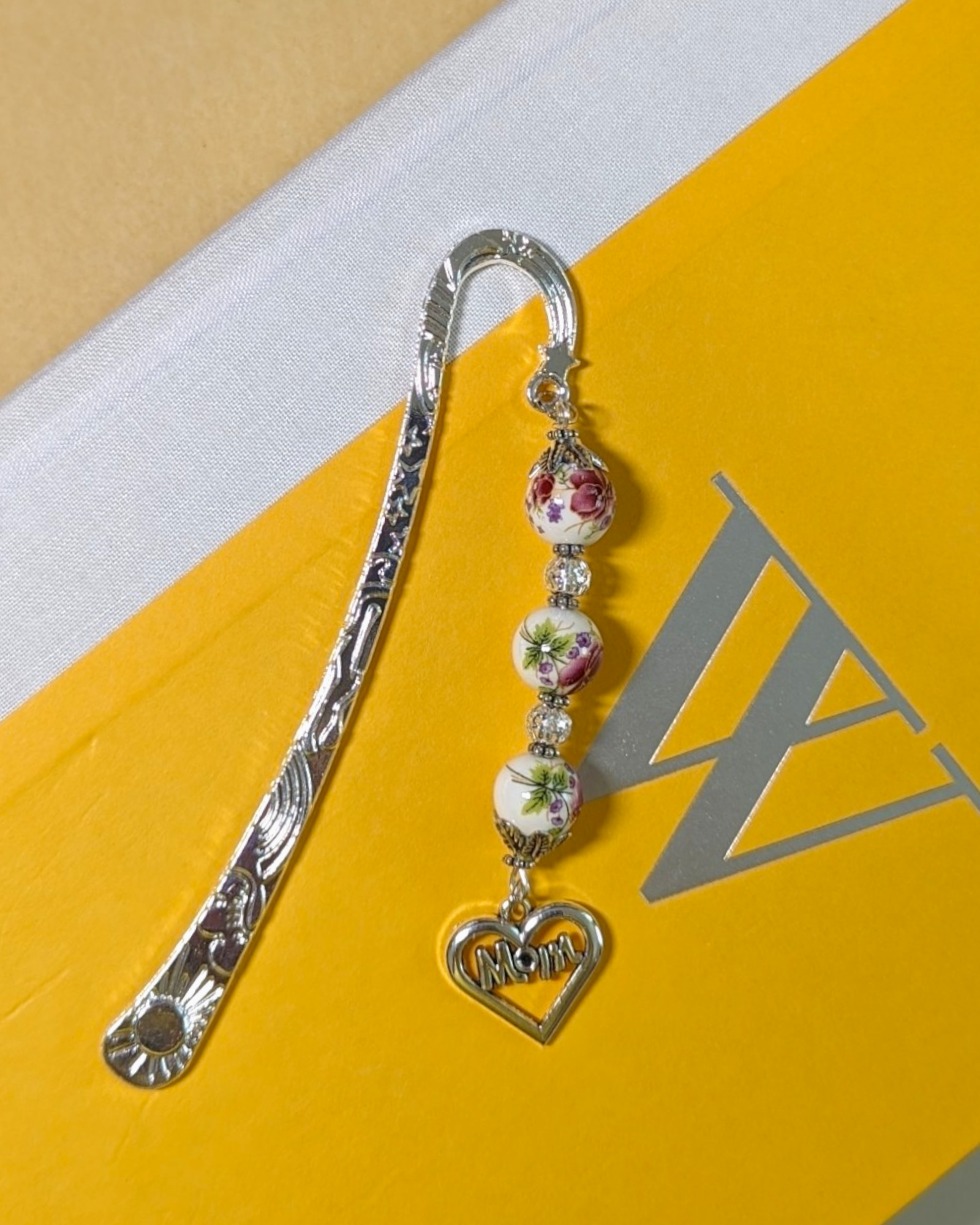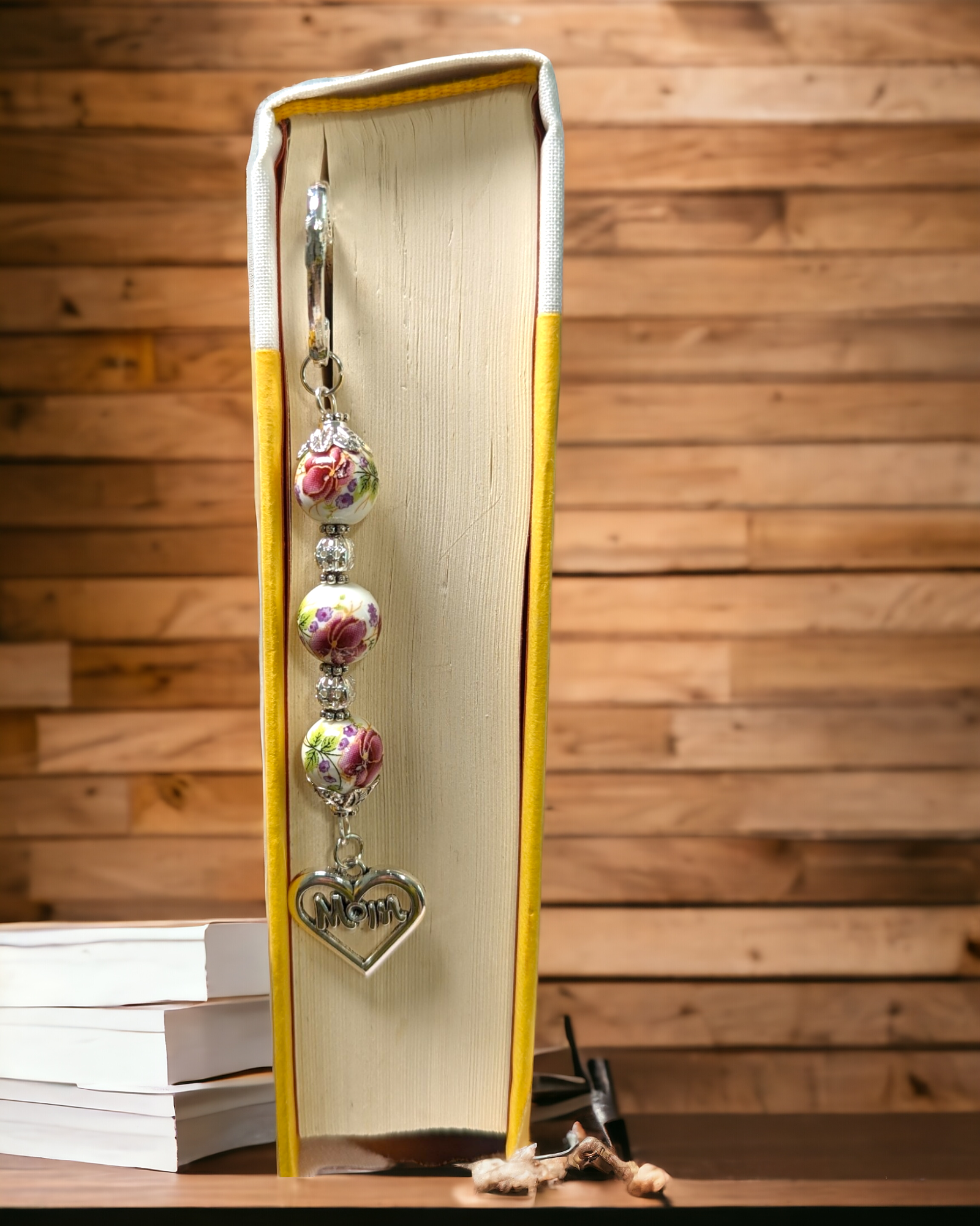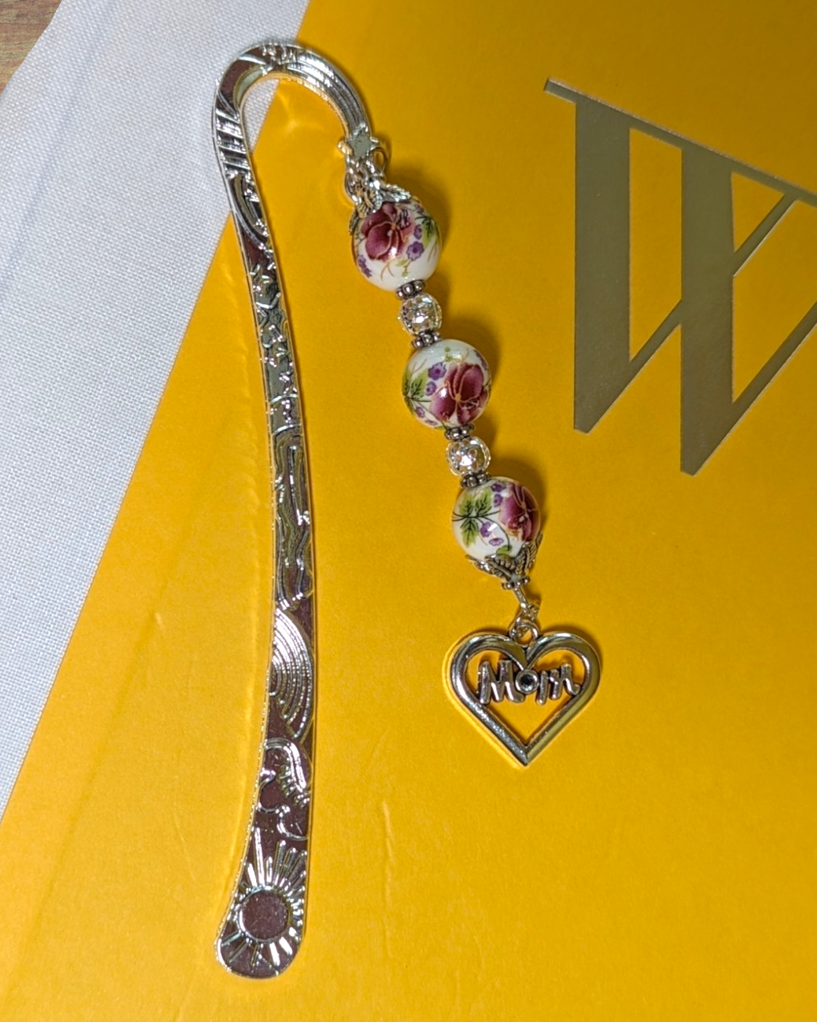 Made with: Silver-plated bookmarker, 12 mm ceramic beads, sterling silver spacer beads, silver tone spacers and bead caps, and silver tone "Mom" charm